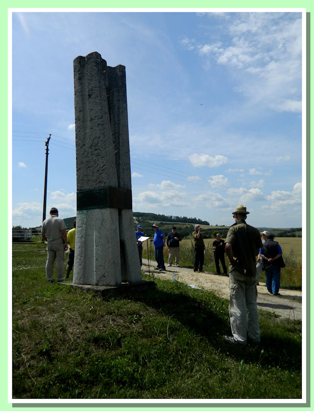 Oldřich Fatka beside Barrande’s Monument in Skryje. Fieldtrip participants at the Barrande Monument in Skryje: Front Row (sitting) left to right: Petr Budil, Oldřich Fatka, Gian Luigi Pillola, Kevin Brett, Evgeny Bushuev, Gulnara Mukhamedjarova. Back row (standing): Jan Jehlička, František Povolný, Gerardo Lopez-Mayoral, Paul Hong, Paul Hille, Joan Antoni Vela, Martina Aubrechtová, Lukáš Laibl, David Holloway, Jakub Vodička, Ilnara Mukhamedyarova, Robert Sensenstein (behind Barrande monument), Mary Hollingsworth, Euan Clarkson, Anastasiya Makarova, Stewart Hollingswoth, Tatyana Pegel, Martina Nohejlová, Benedicte van Lidth.