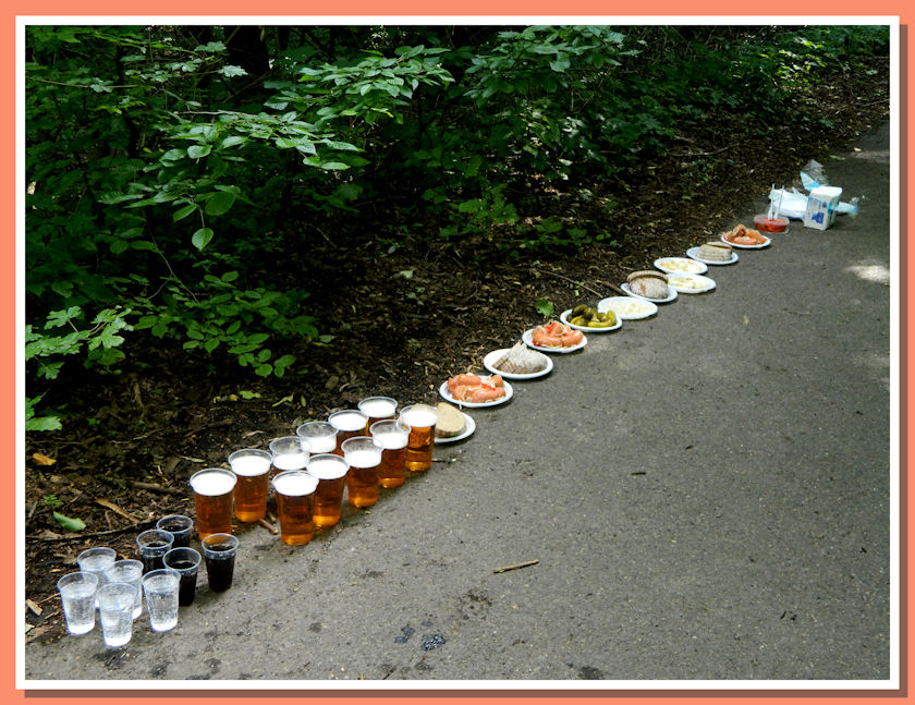 The last stop of the day was at Černá rokle near Kosoř. This is one of the oldest quarries in the Czech Republic and is in the Lochov and Praha Formations, lower Devonian. After leading us up to the site, our hosts told us to collect for about 30 minutes and then mysteriously disappeared. When we walked back down to the trail, and surprise, surprise, here were our hosts beside a feast they had laid out along the trail. We dined on smoked salmon, smoked sausages, Hermelin cheese in oil, all sorts of pickles and condiments, and nice cold Pilsner beer. A nice treat at the end of our 4 day adventure.